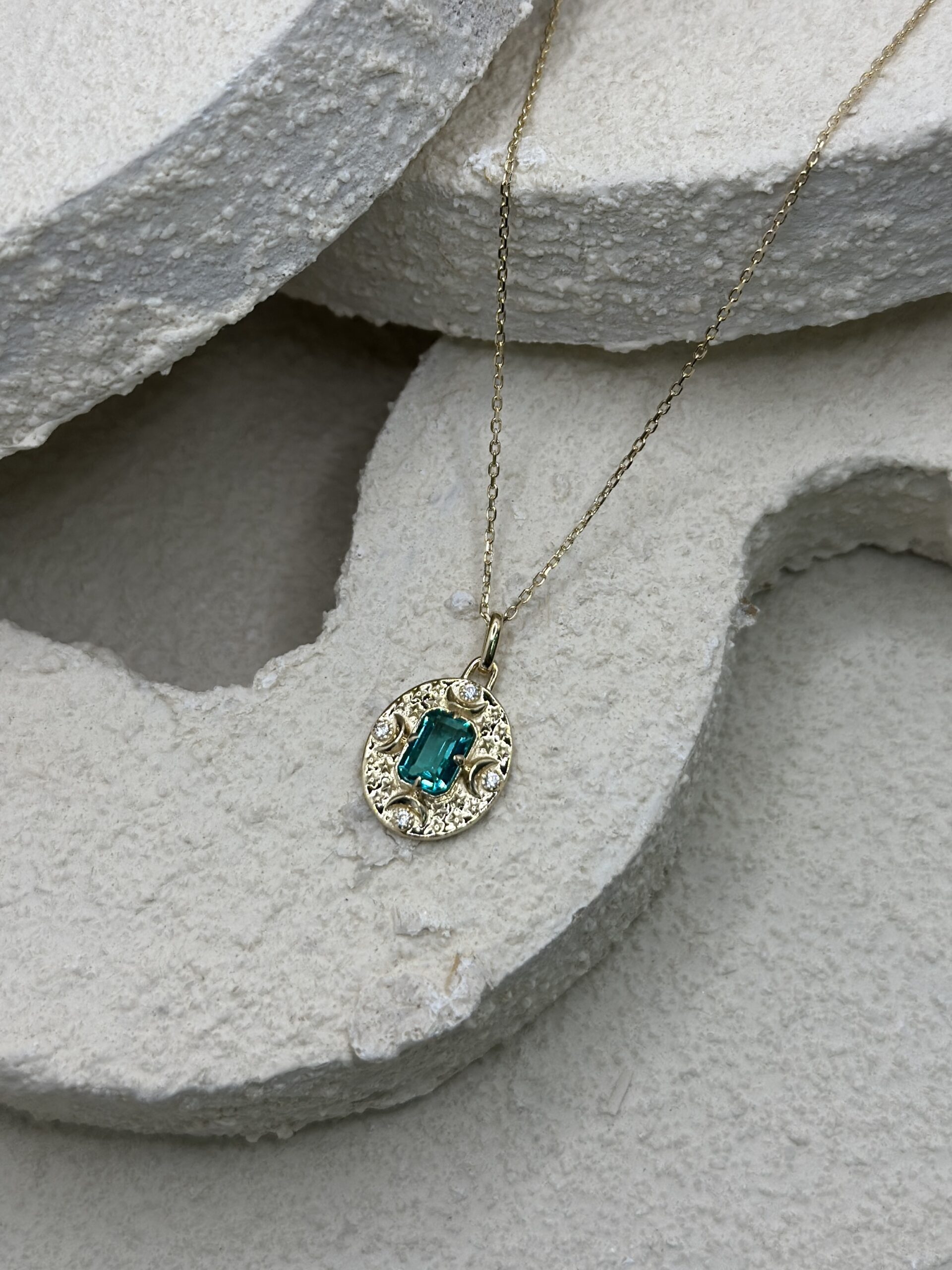 Umgeben wird der Mittelstein von einer kunstvoll strukturierten, goldenen Oberfläche mit kleinen, kreisrunden Fassungen, die jeweils mit klaren Zirkonia-Steinen besetzt sind. Diese Anordnung erinnert an antike Zierplatten und verleiht dem Anhänger eine luxuriöse, fast königliche Ausstrahlung.